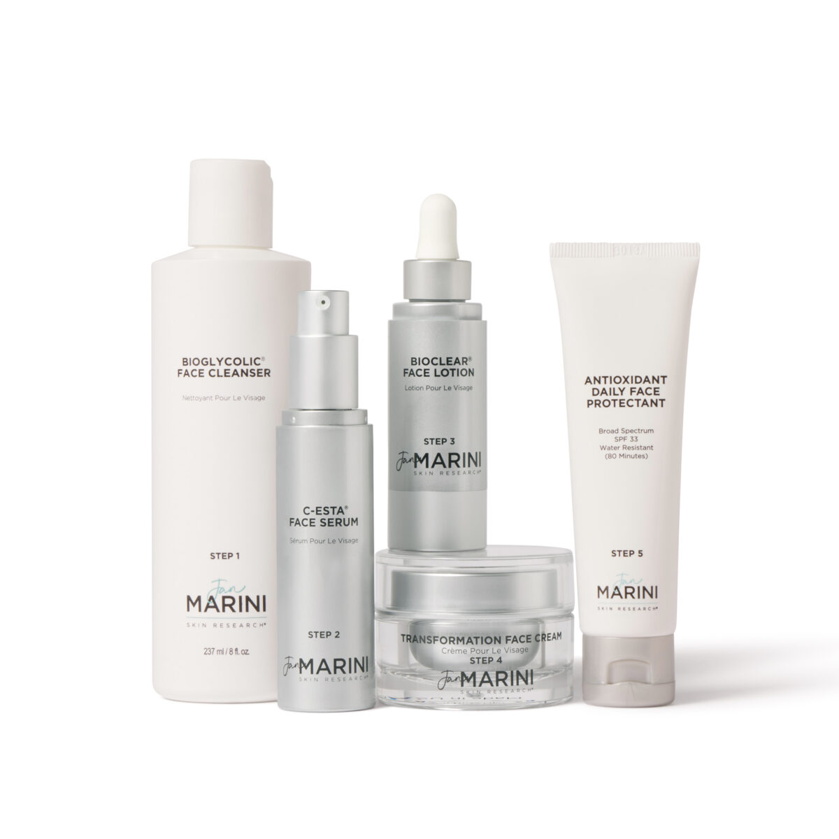 Cleanse on dry skin with Bioglycolic® Face Cleanser. Rinse thoroughly. Pump your Vitamin-C serum, C-ESTA® Face Serum, into your palm and apply sparingly to rejuvenate your skin. All’s Clear with Bioclear! For normal skin, apply Bioclear® Face Lotion, for dry skin, apply Bioclear® Face Cream sparingly to the entire face. Hydrate your skin with Transformation Face Cream, for normal skin and Age Intervention® Face Cream, for dry. Apply sparingly over entire face. Finish your Jan Marini 5-step skin care routine with the ultimate SPF protection. Antioxidant Daily Face Protectant OR Marini Physical Protectant. Reapply every 2 hours throughout the day. Not needed at night.